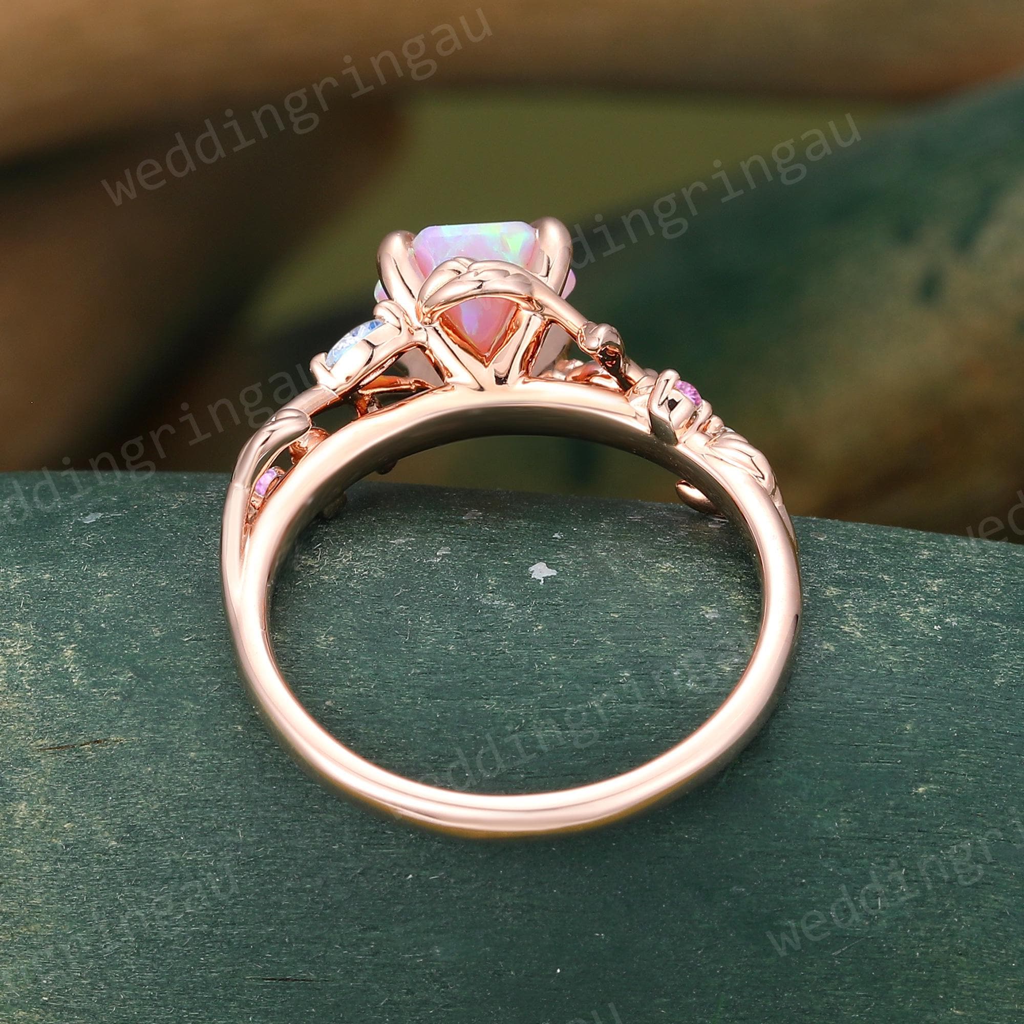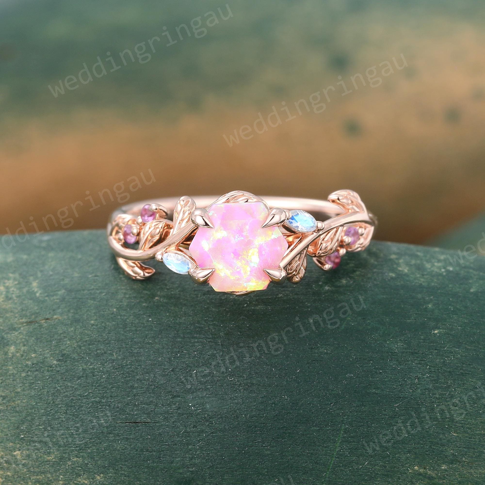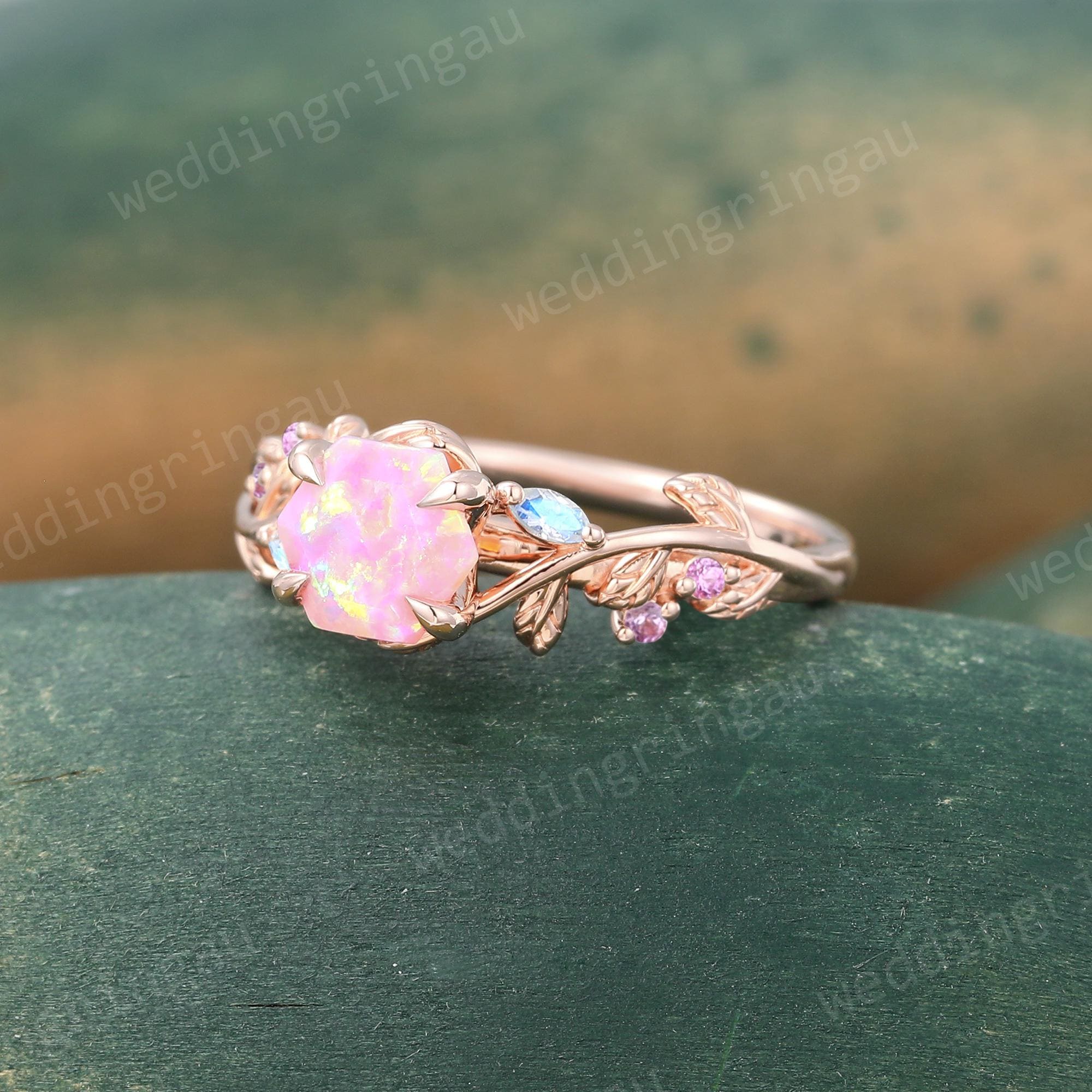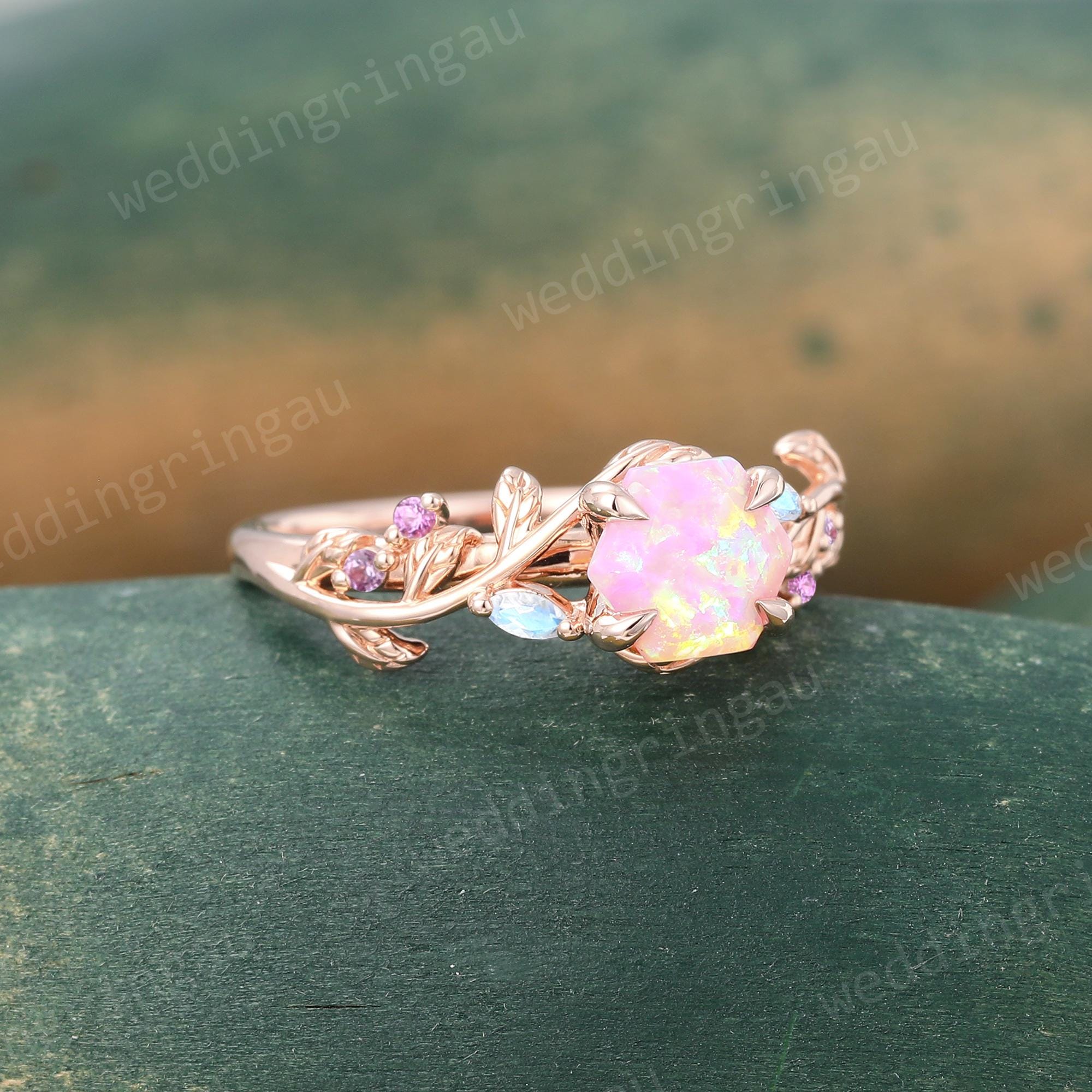 Vintage Hexagon cut Pink Opal ring Unique Rose Gold Leaf Engagement Ring Marquise cut Moonstone ring Amethyst ring Nature Inspired Ring Gift