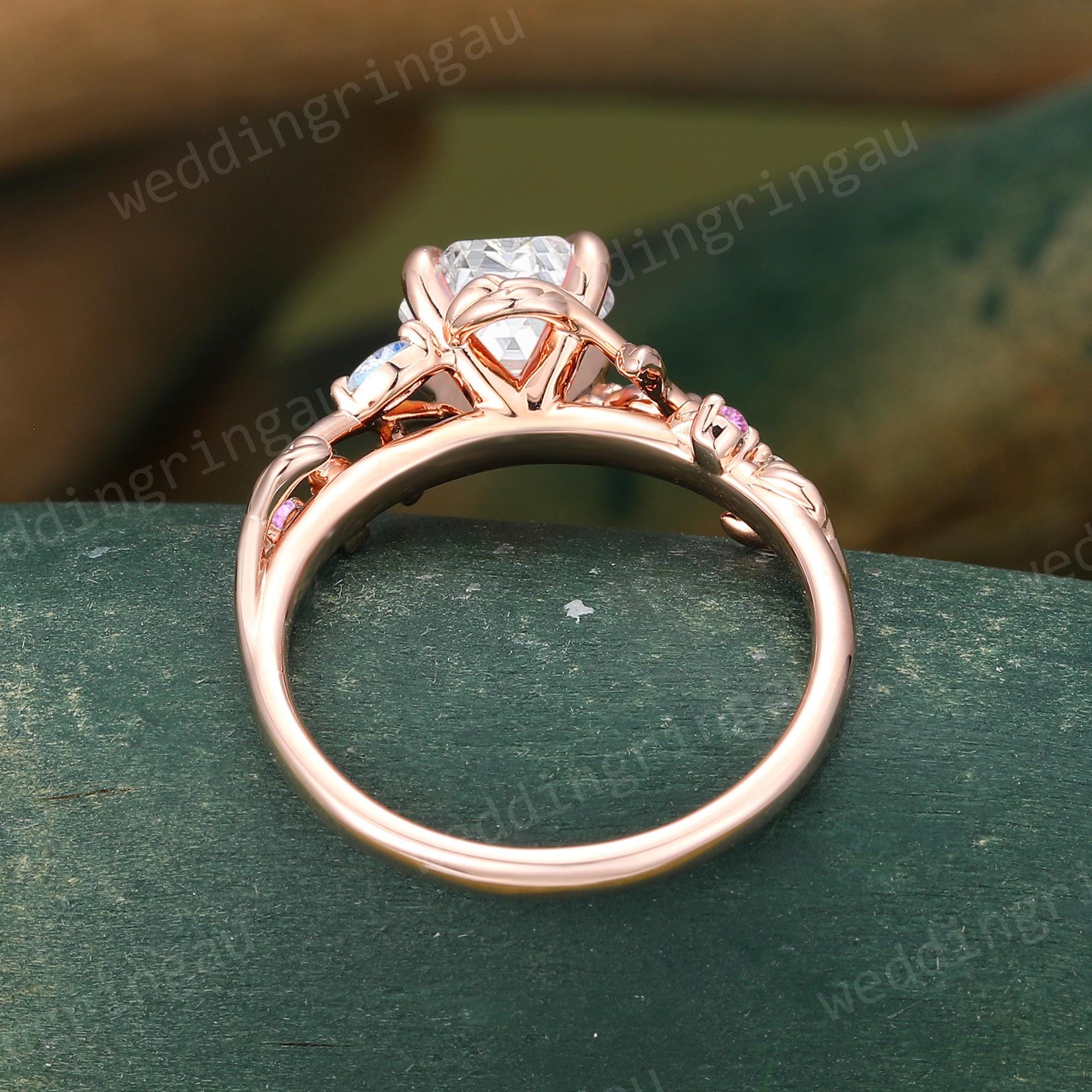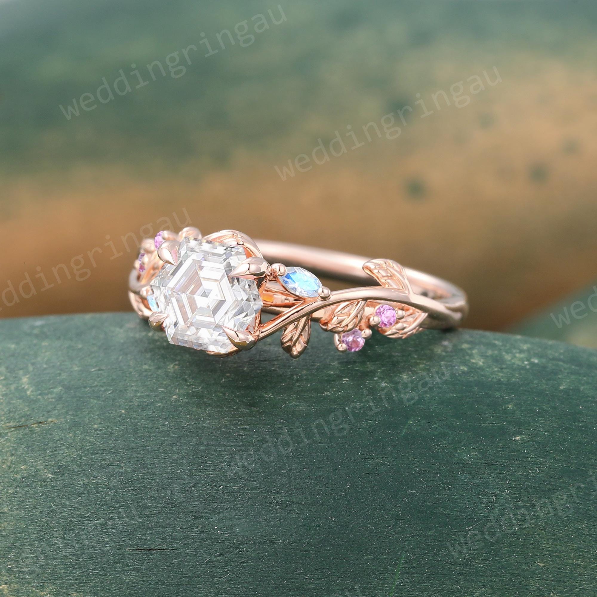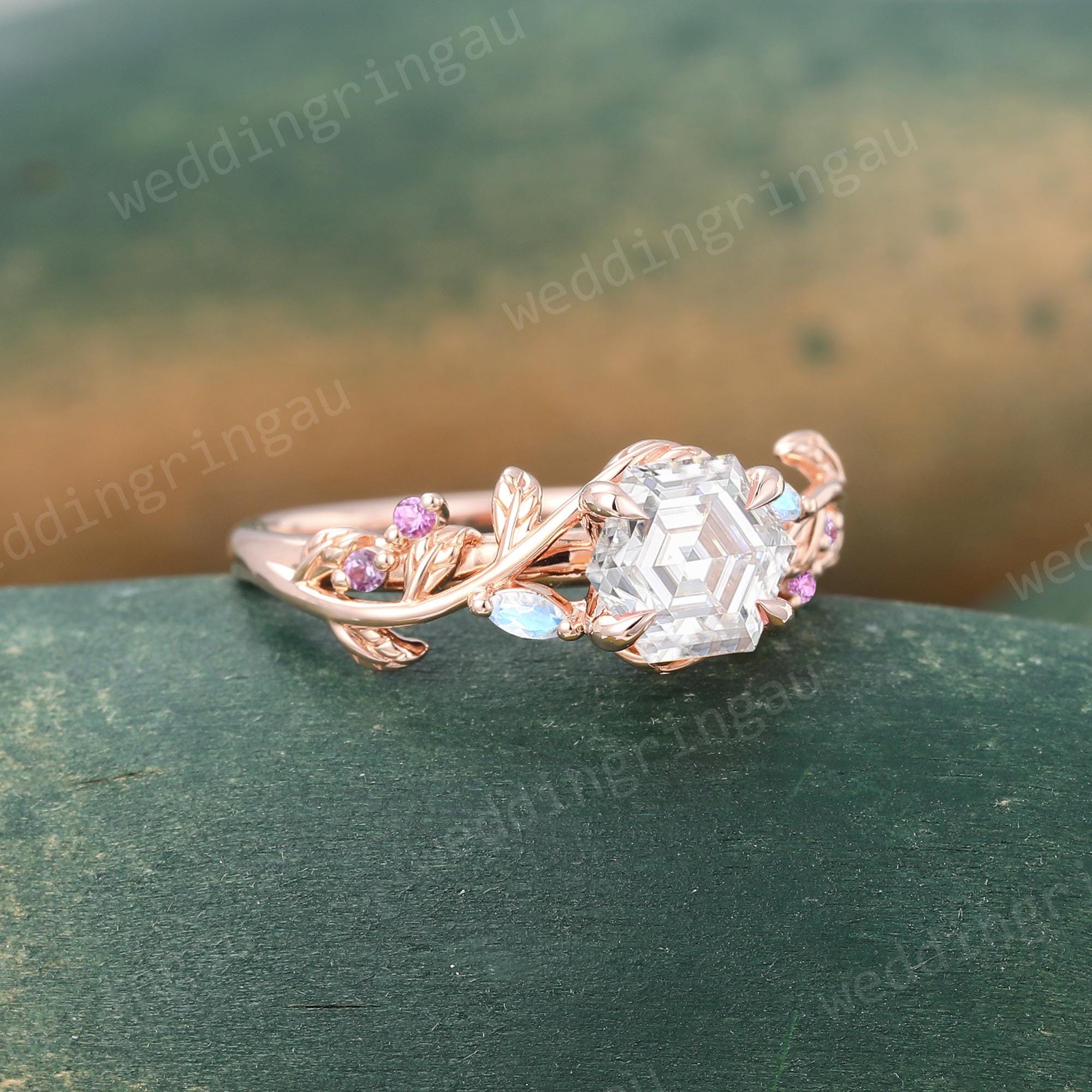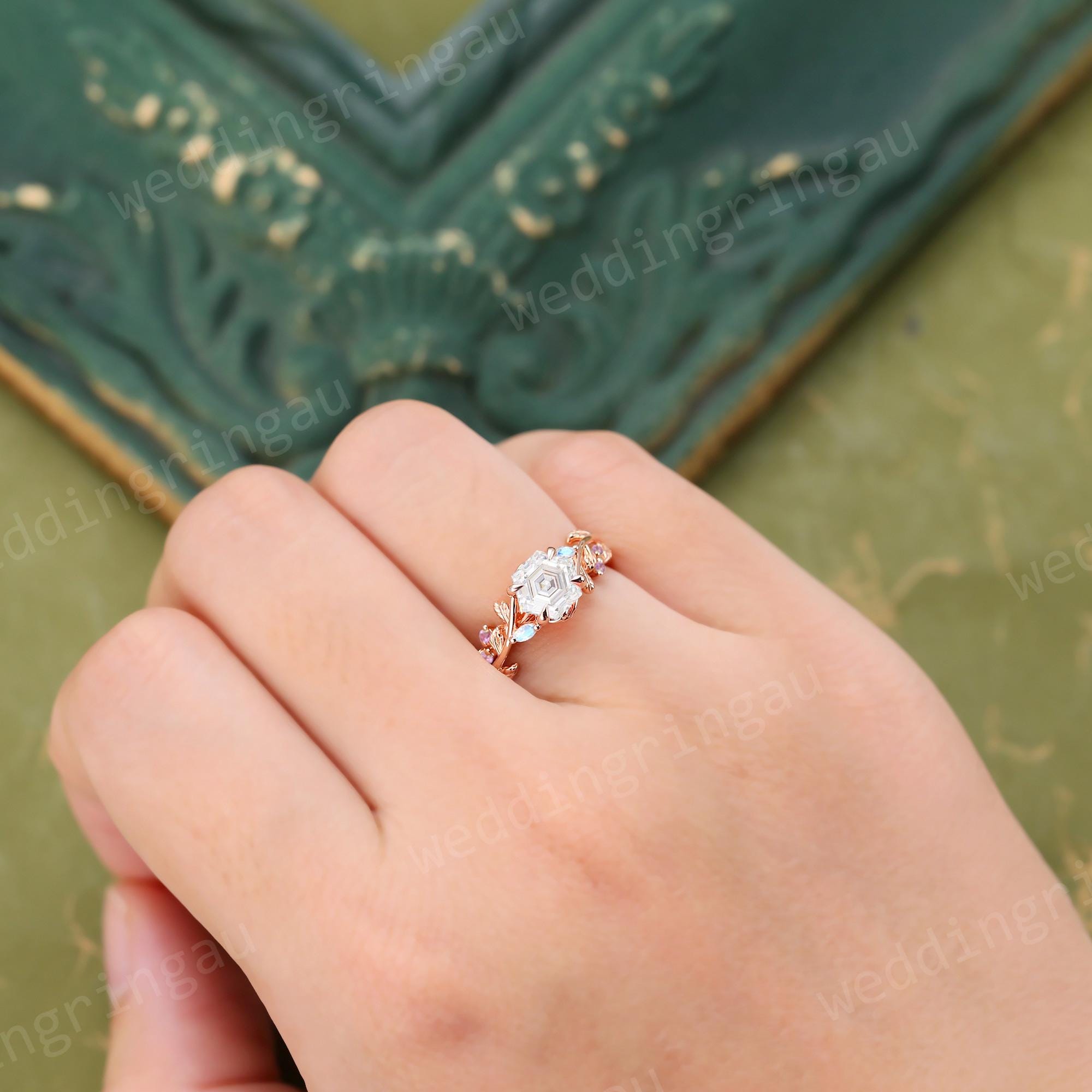 Art Deco Hexagon Cut Lab Grown Diamond Ring Unique Rose Gold Branch Vine Engagement Ring Marquise cut Moonstone Ring Promise Gift for Her
