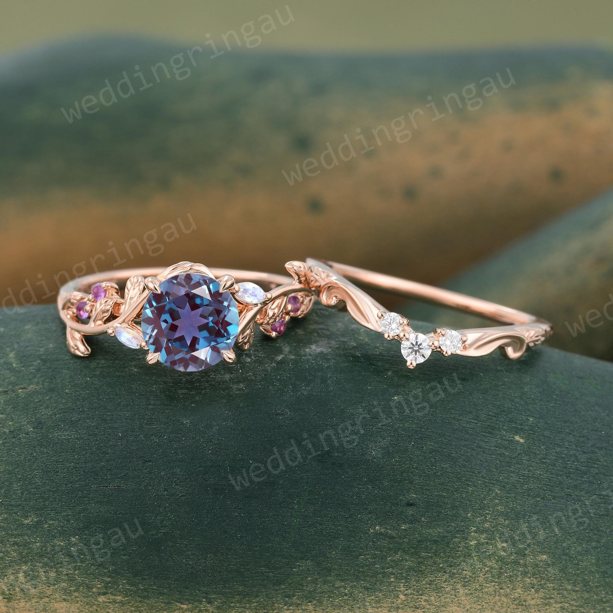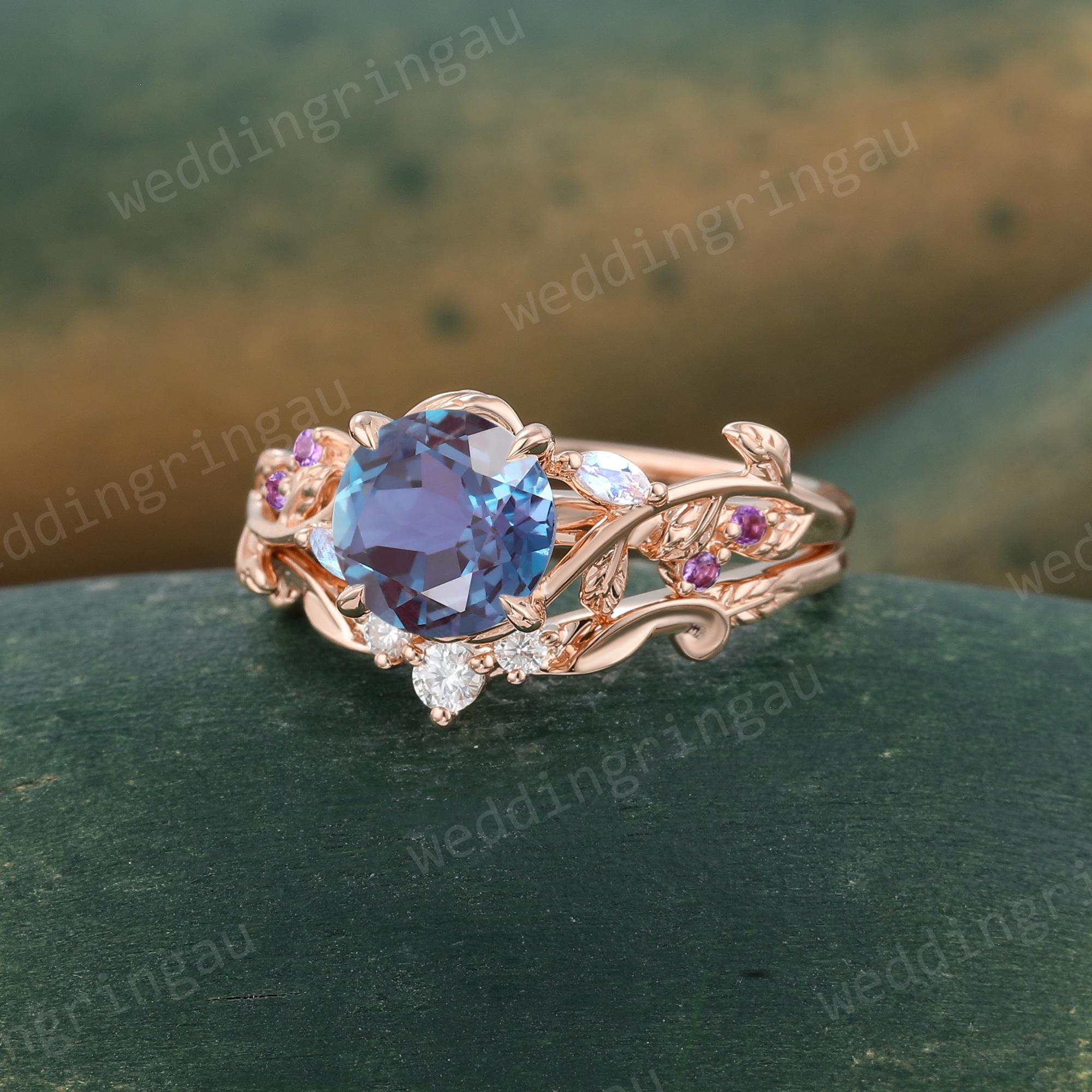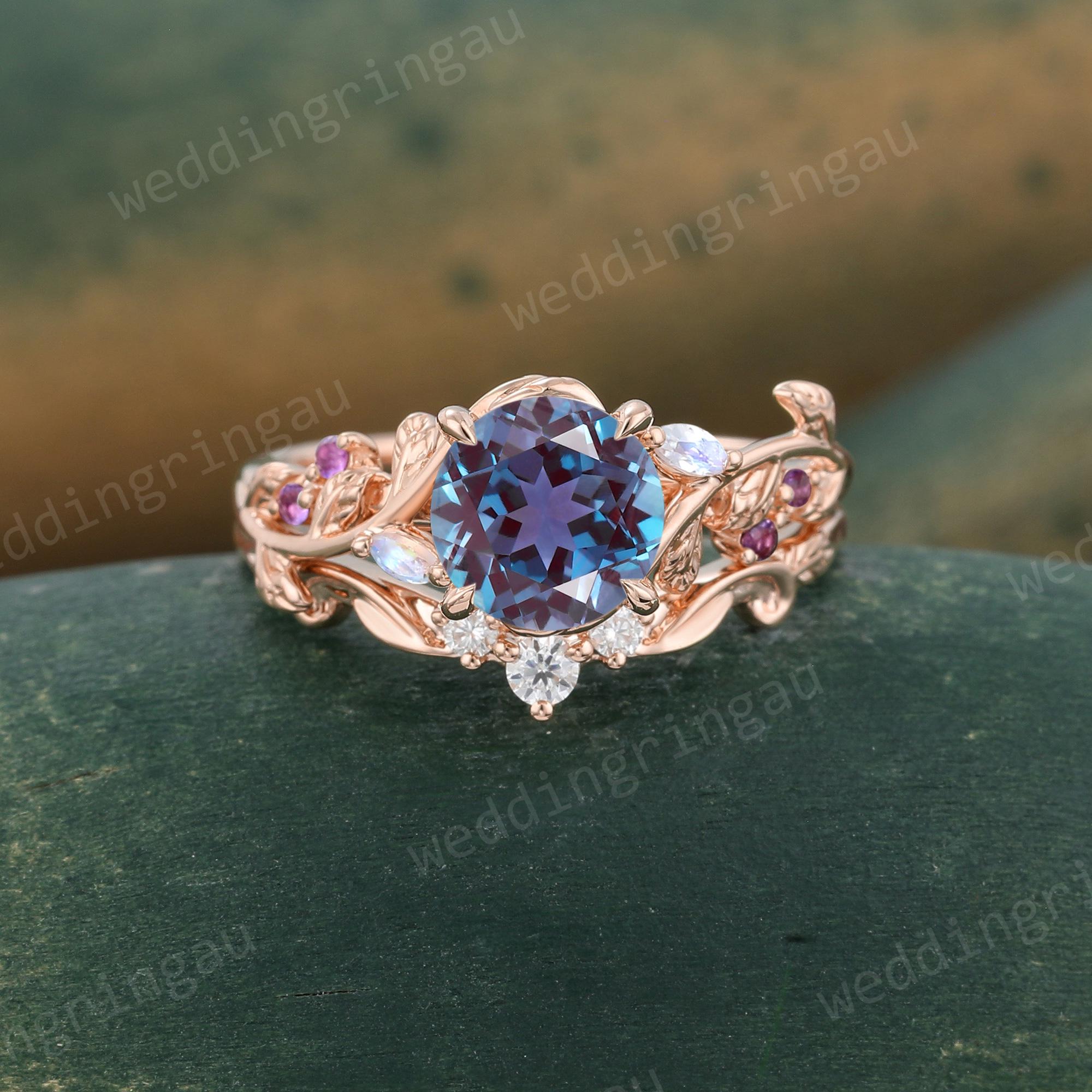 Round Alexandrite Engagement ring set Vintage Twig engagement ring Leaf Design Moissanite wedding ring set Amethyst ring Promise ring set