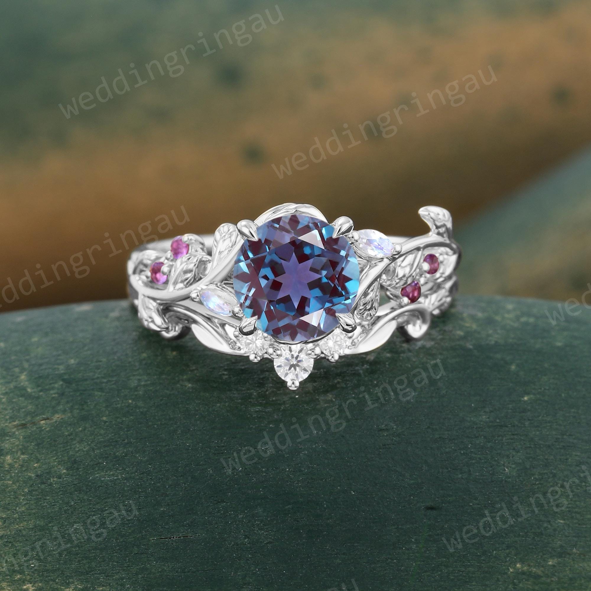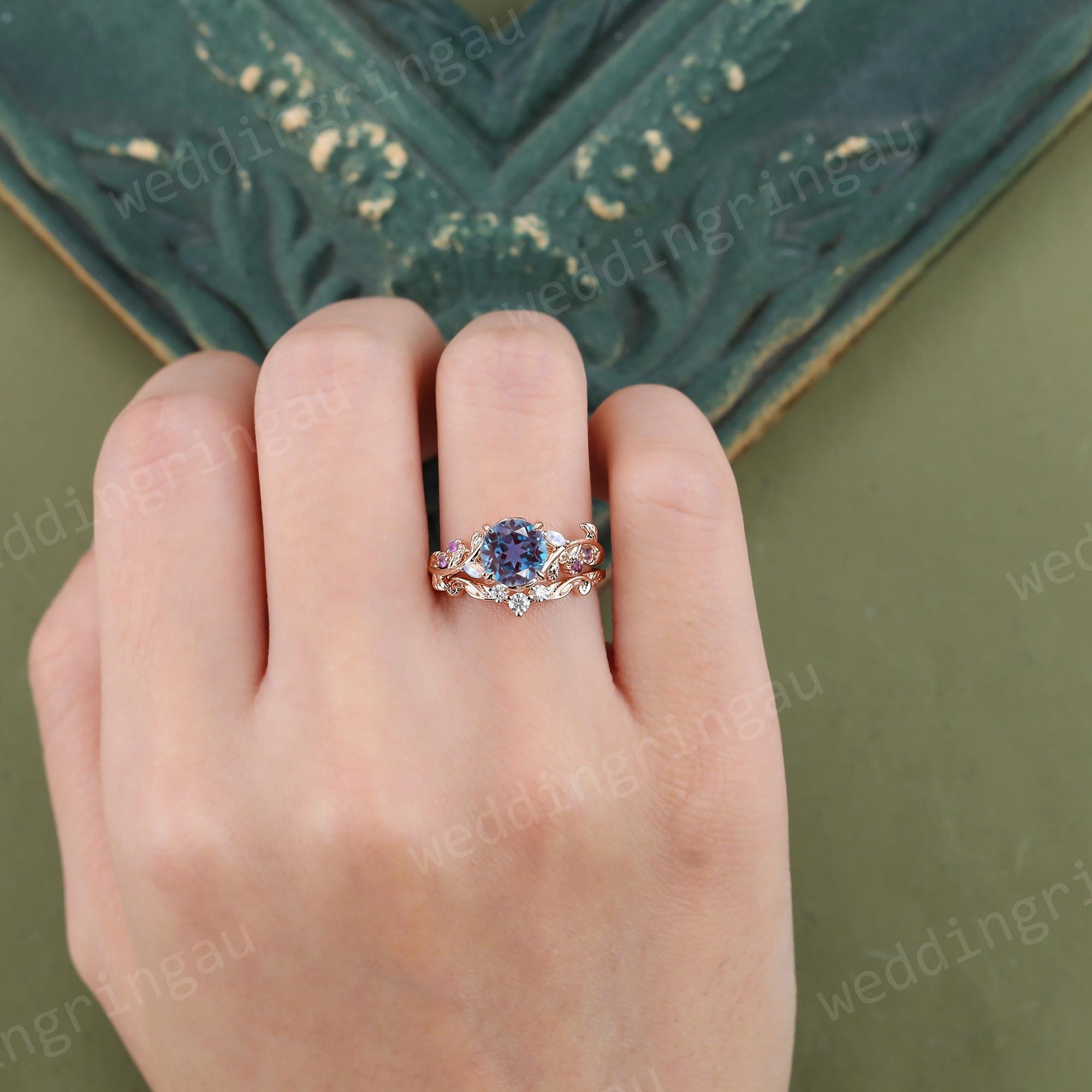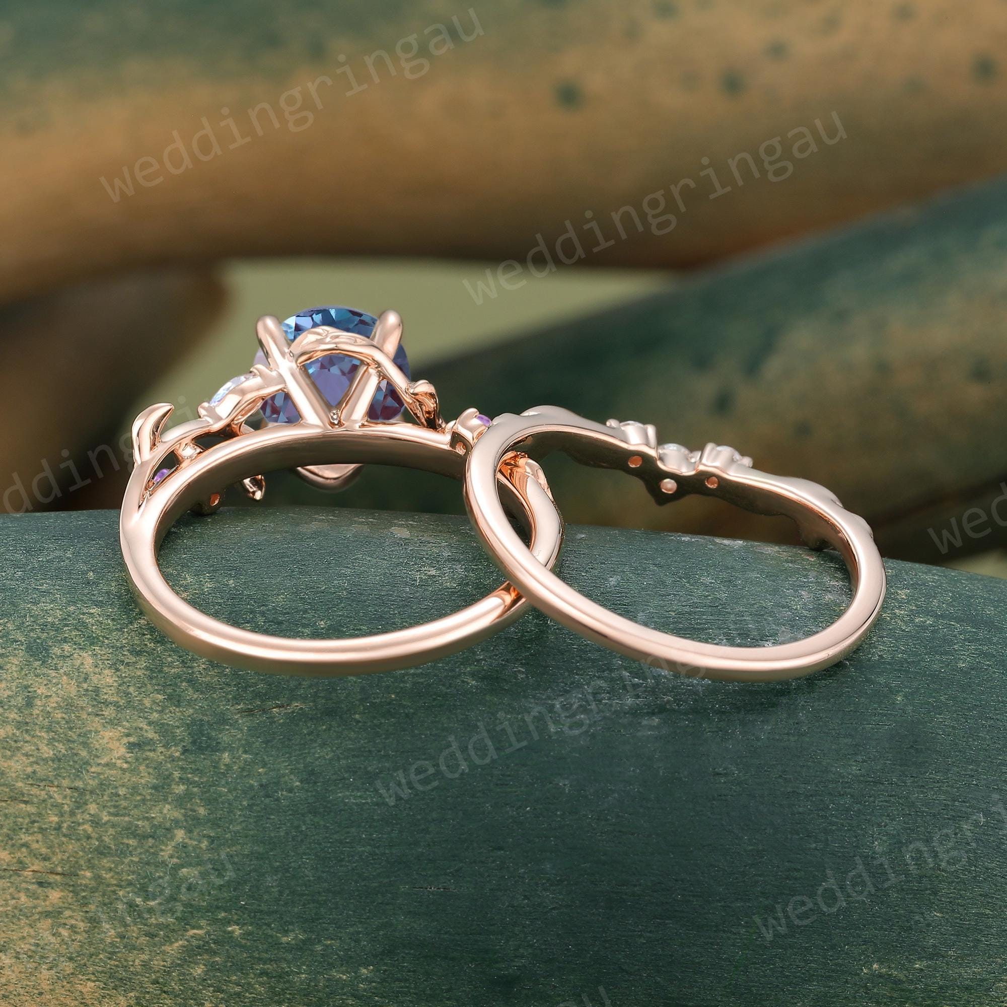 Round Alexandrite Engagement ring set Vintage Twig engagement ring Leaf Design Moissanite wedding ring set Amethyst ring Promise ring set