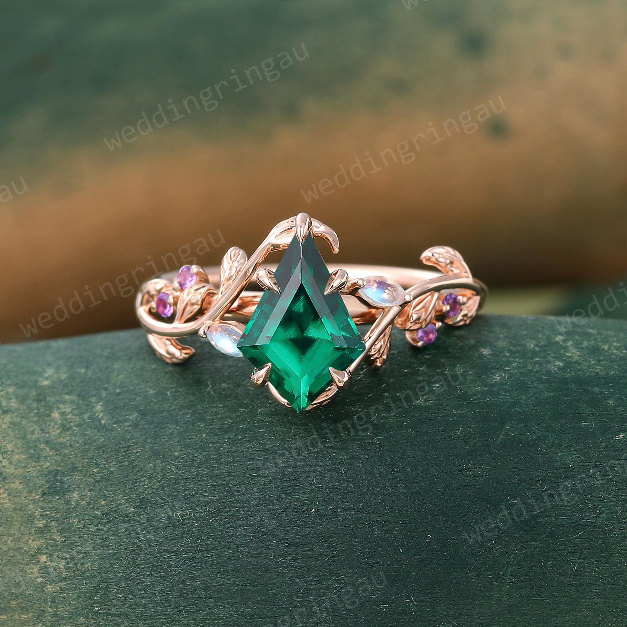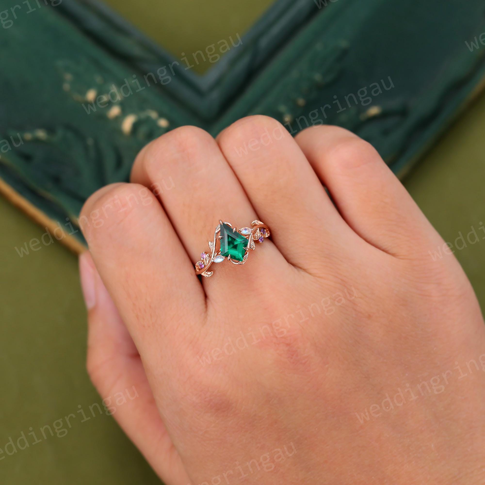 Kite cut Emerald ring Unique Rose gold Leaf engagement ring Marquise cut Moonstone ring Amethyst ring Nature inspired Twig ring Women Gift