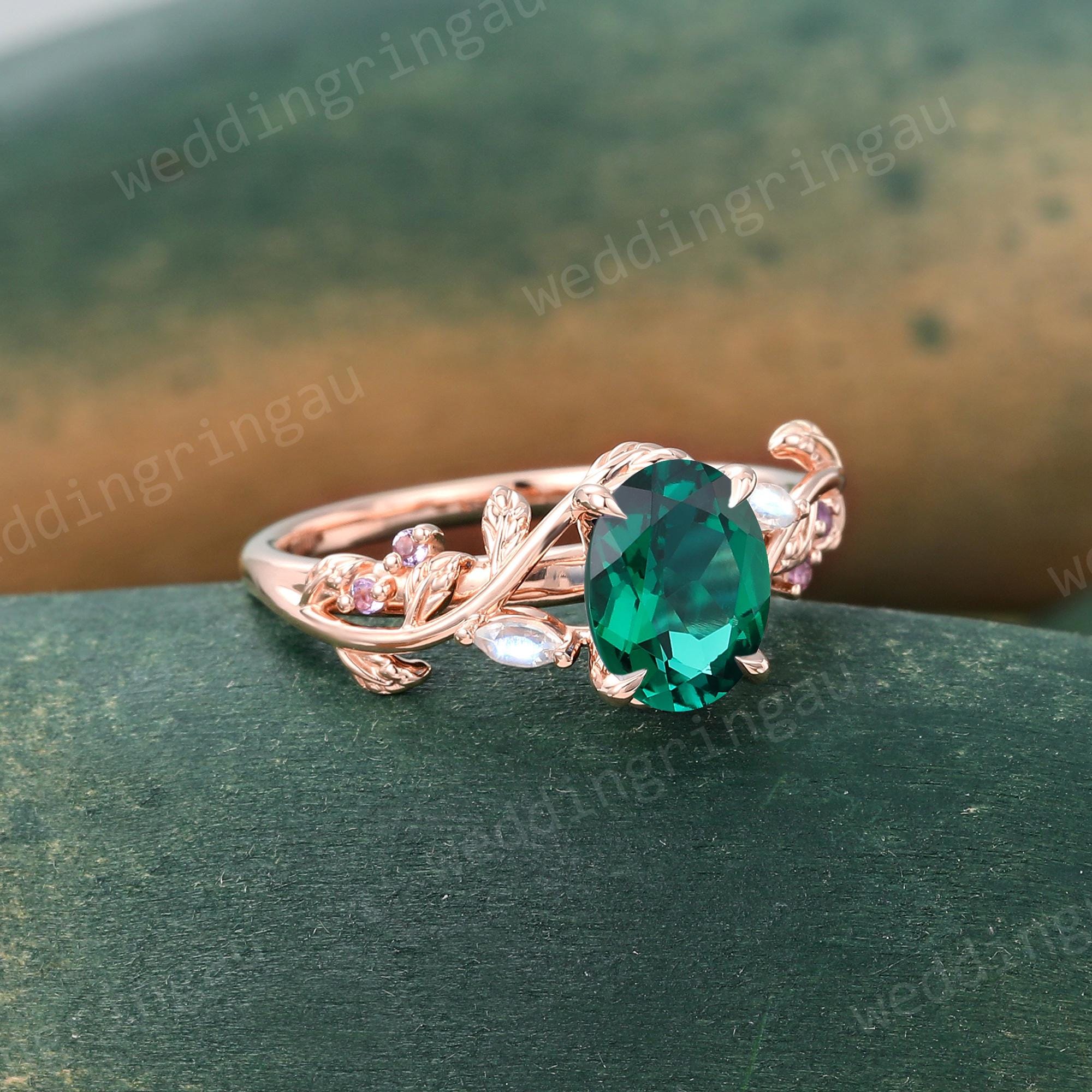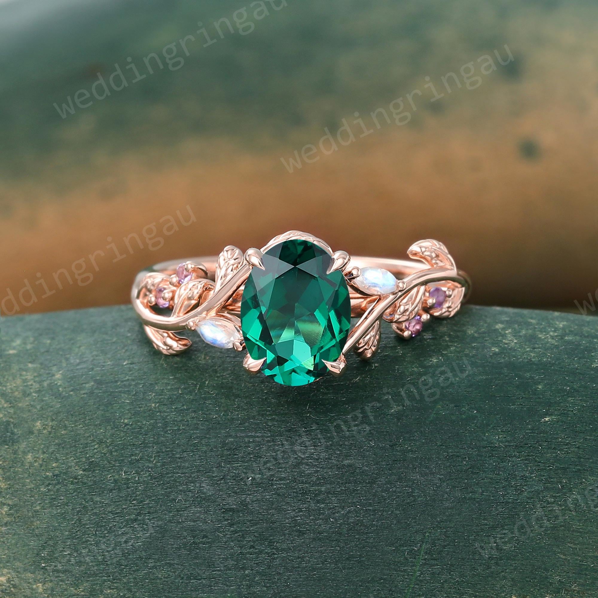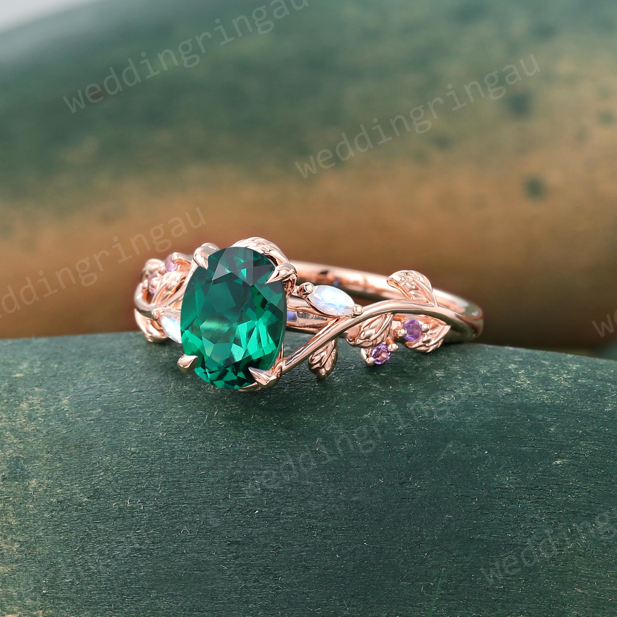 Oval cut Emerald ring Unique Rose gold Leaf engagement ring Marquise cut Moonstone ring Amethyst ring Nature inspired Twig wedding ring Gift