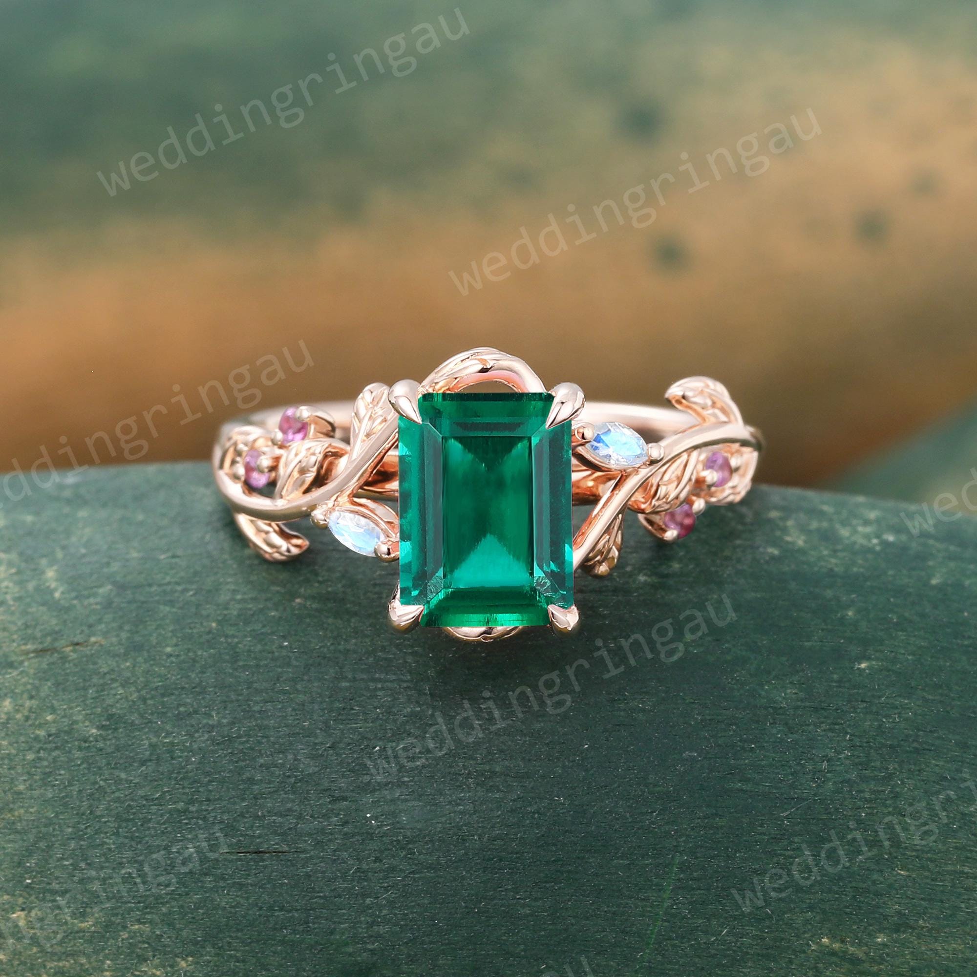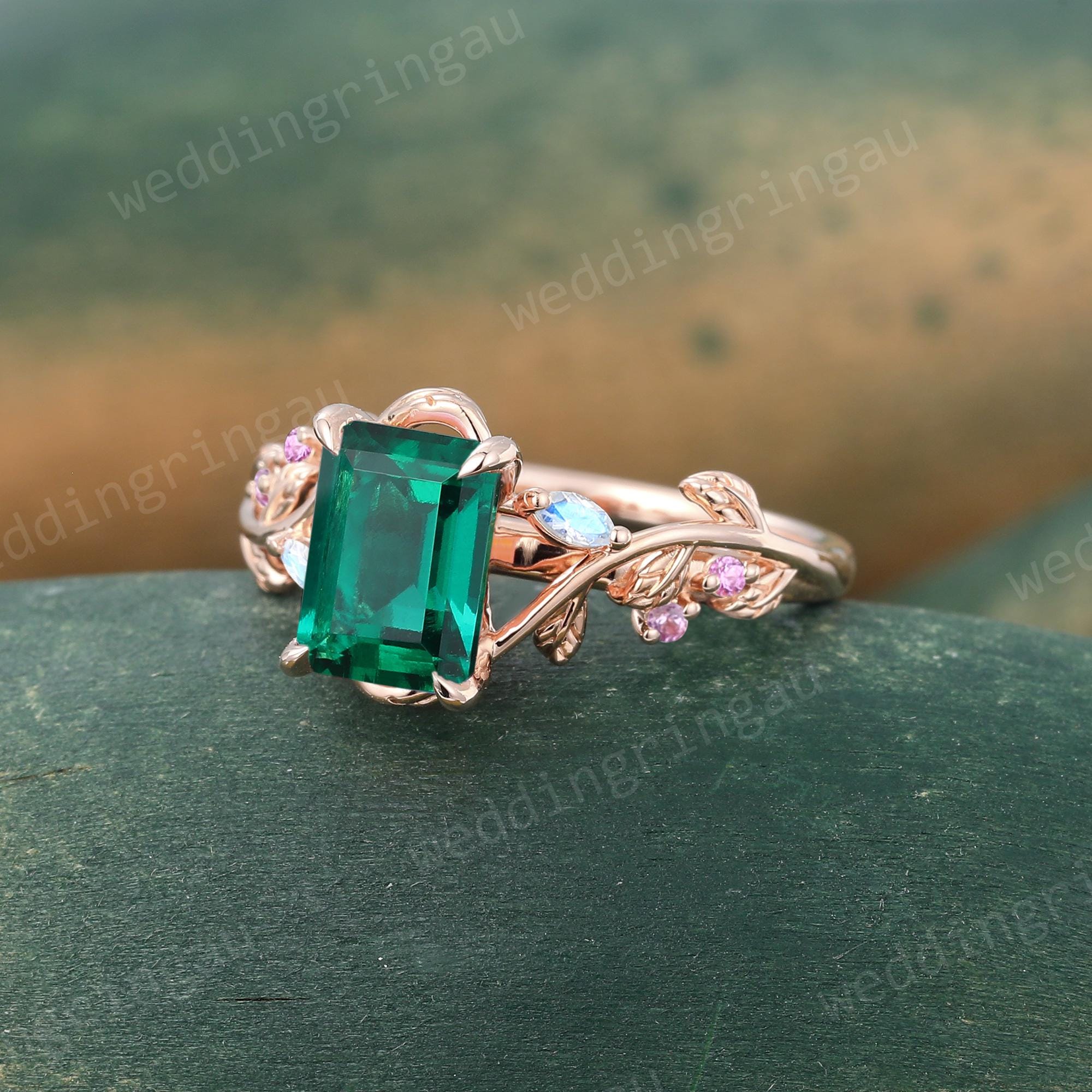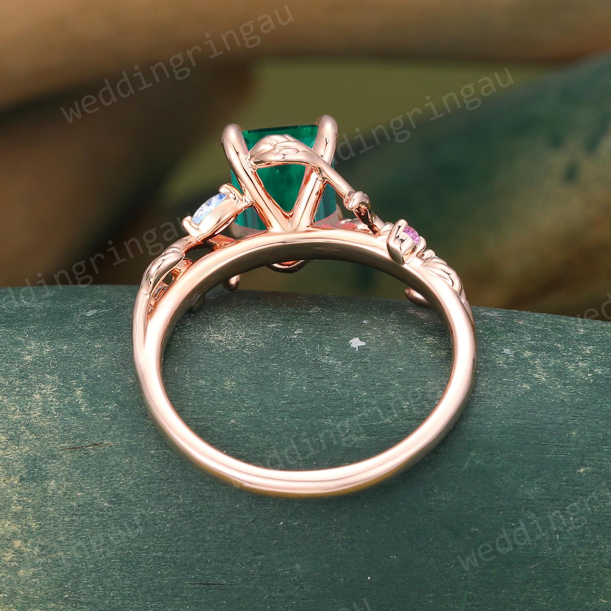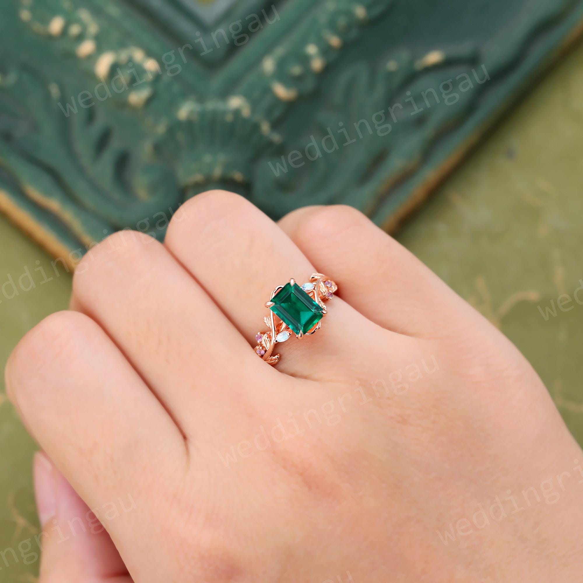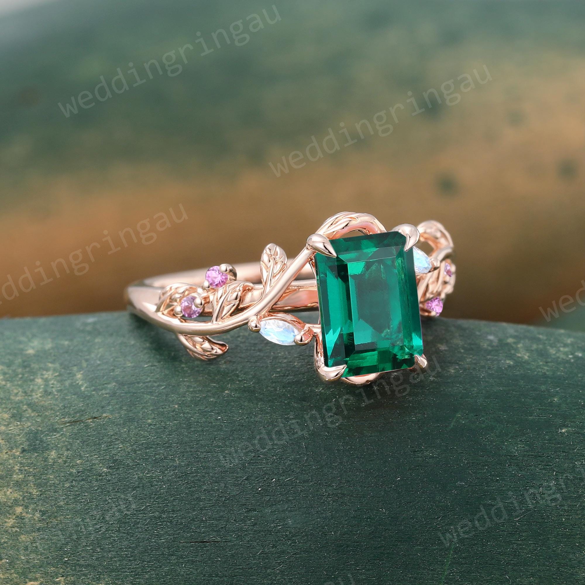 Emerald Cut Emerald Ring Unique Rose Gold Branch Vine Engagement Ring Marquise Cut Moonstone Ring Nature Amethyst Inspired Twig Ring Gift