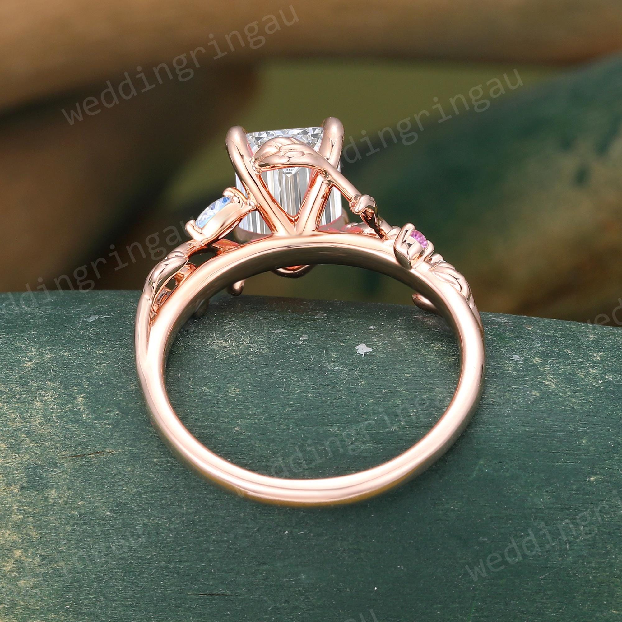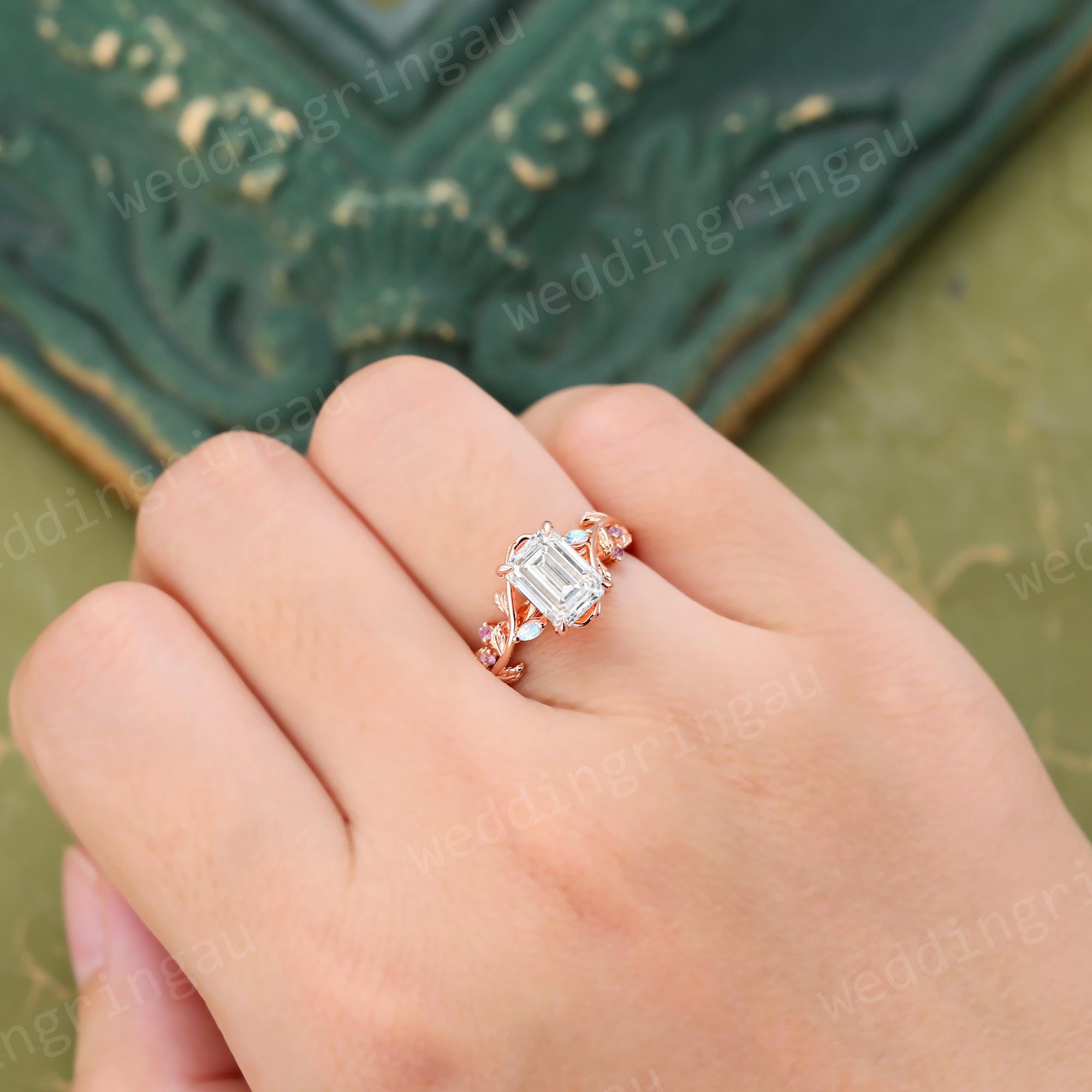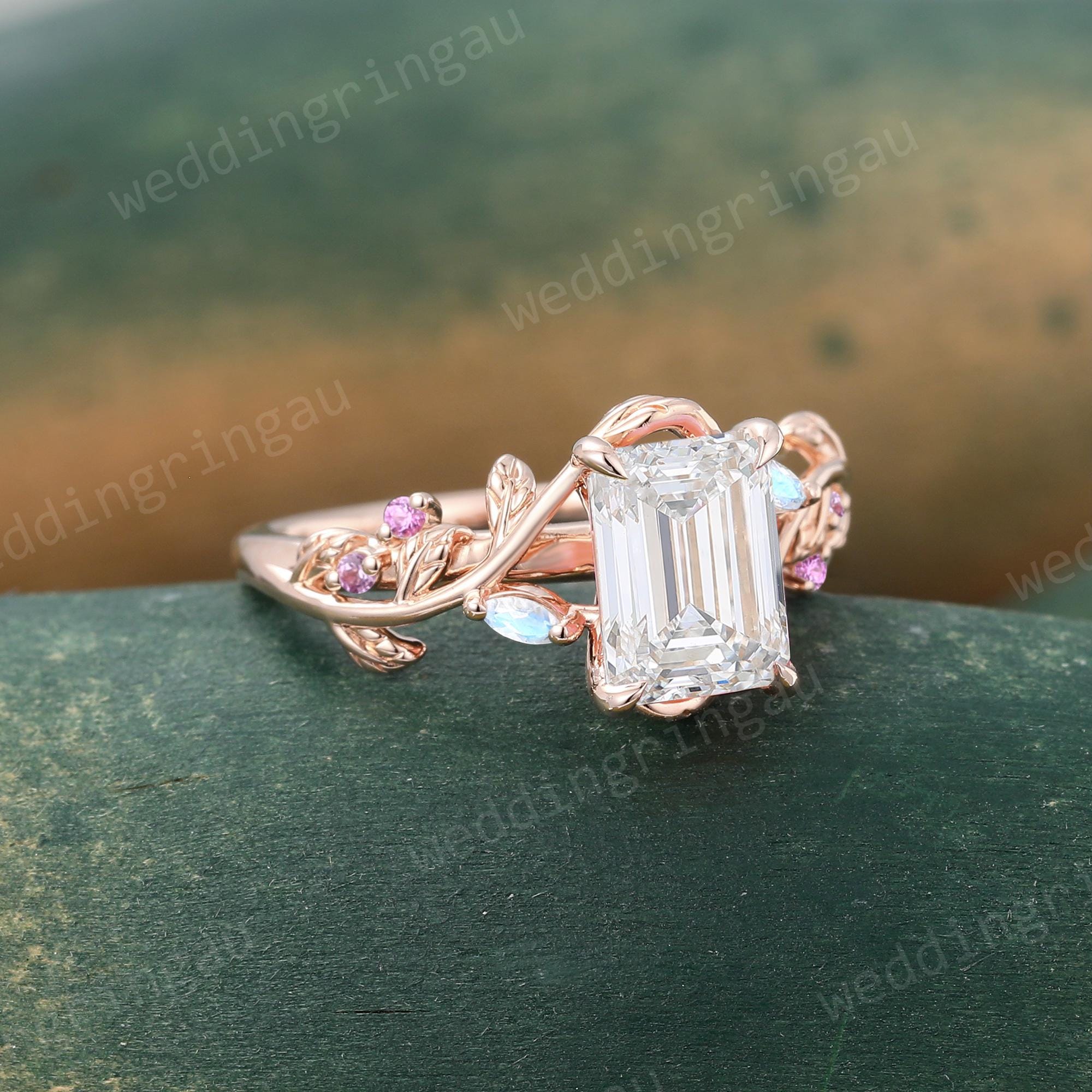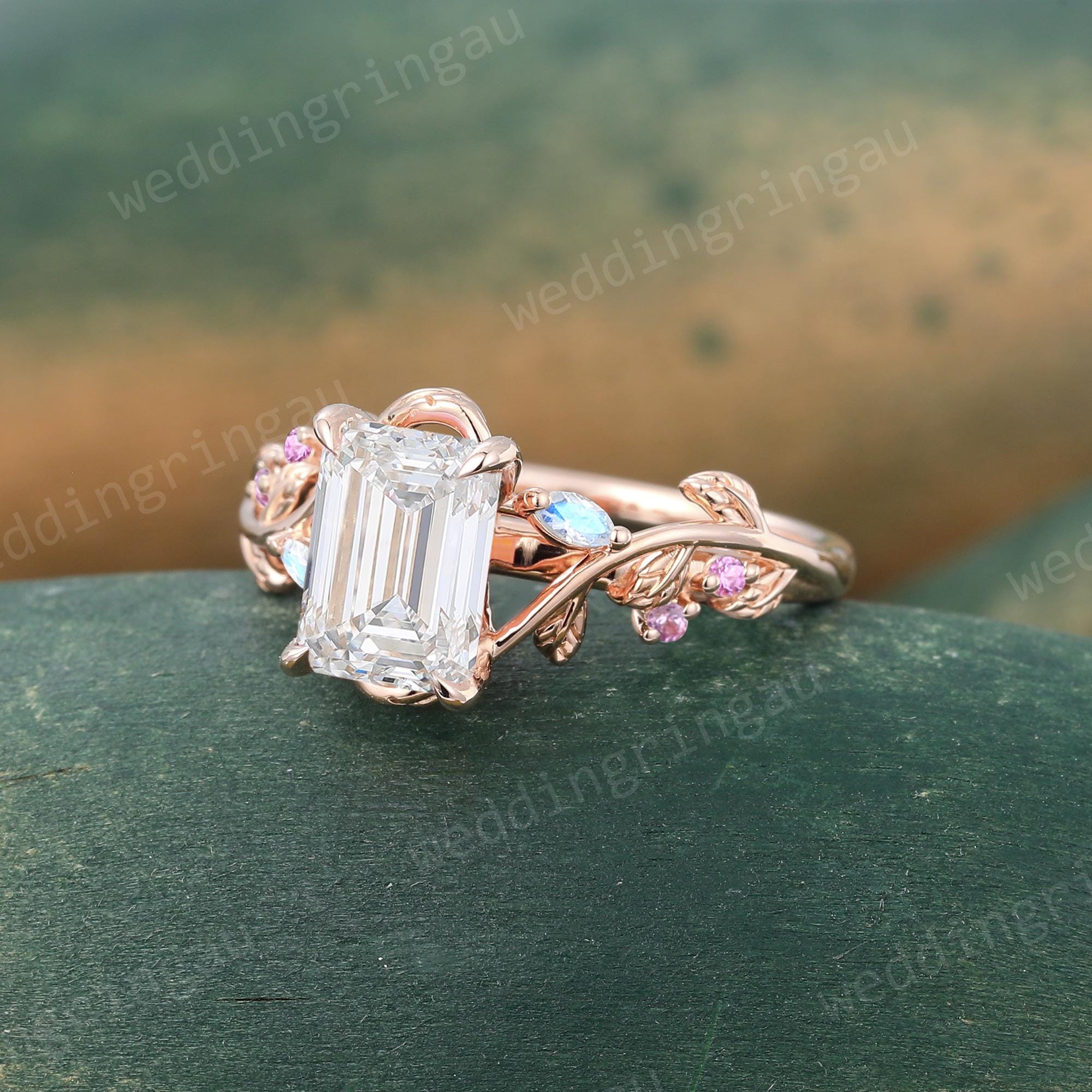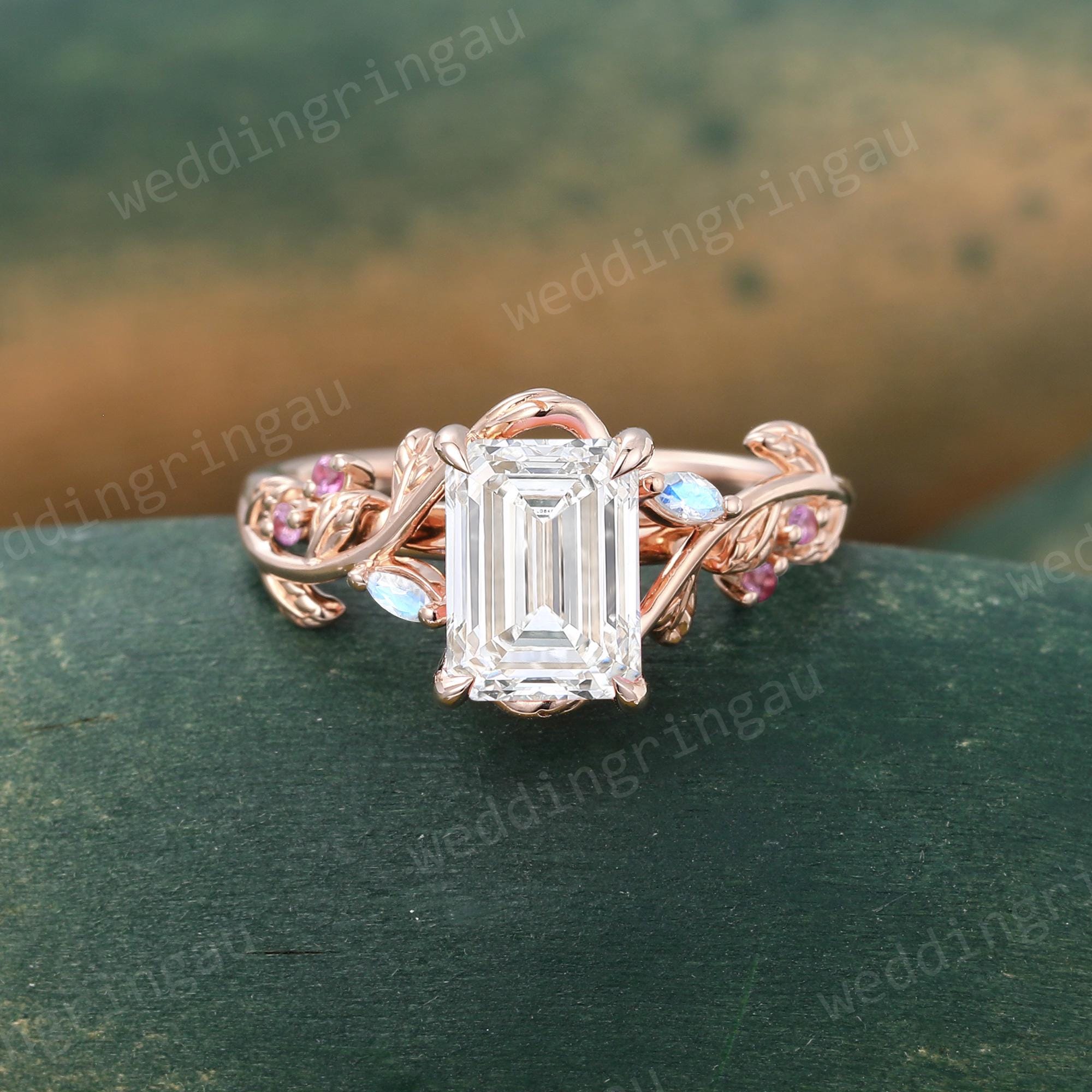 1.5CT Emerald Cut Lab Grown Diamond Ring Unique Rose Gold Branch Vine Engagement Ring Marquise cut Moonstone Ring wedding ring Promise Gift